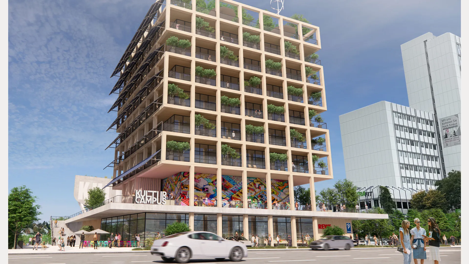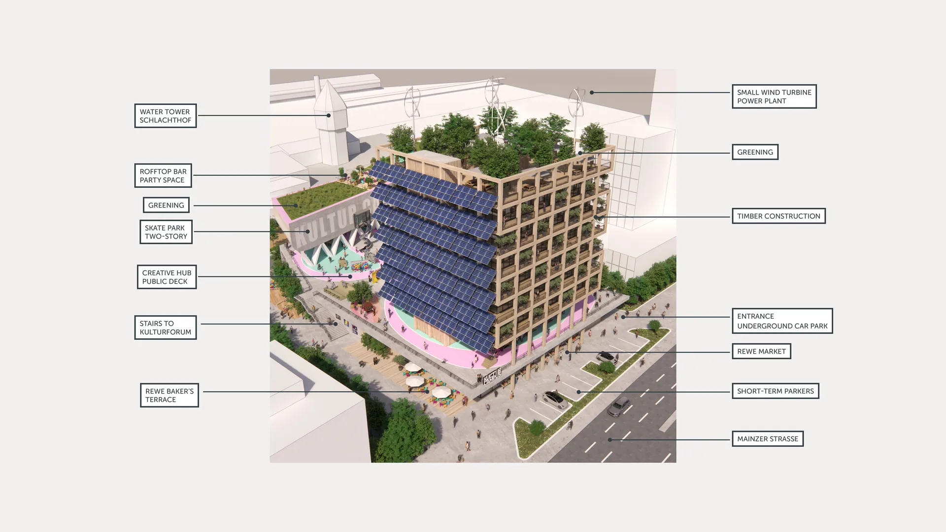 Facing Mainzer Straße, a distinct office tower expresses the project’s contemporary and sustainable character — a symbol of low-carbon construction and progressive urban development. Designed with hybrid timber structures, local energy systems, green façades, and rooftop gardens, the building will host flexible offices, a hotel, and a Hip-Hop Museum at street level.