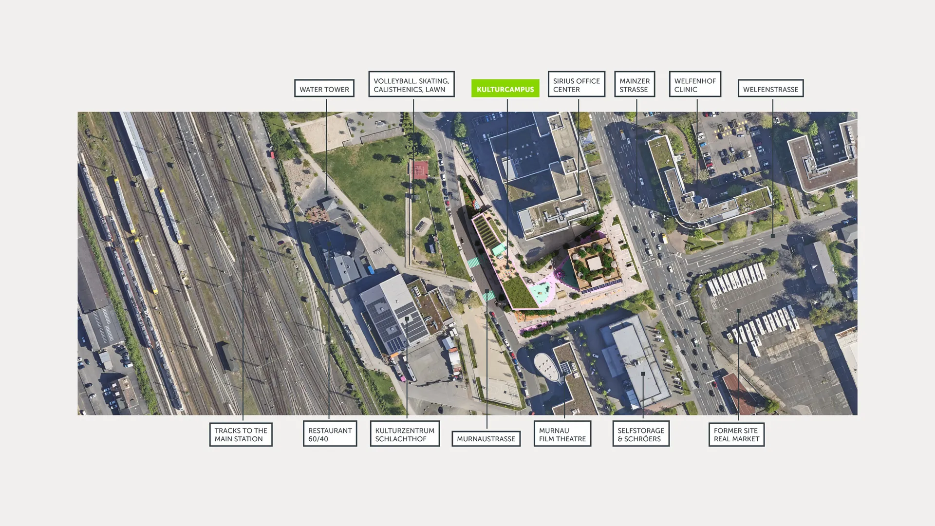The development site, located along Mainzer Straße and currently occupied by outdated commercial structures, sits at one of Wiesbaden’s main entrances — directly adjacent to the Schlachthof, one of Germany’s most renowned centers for youth and music culture.