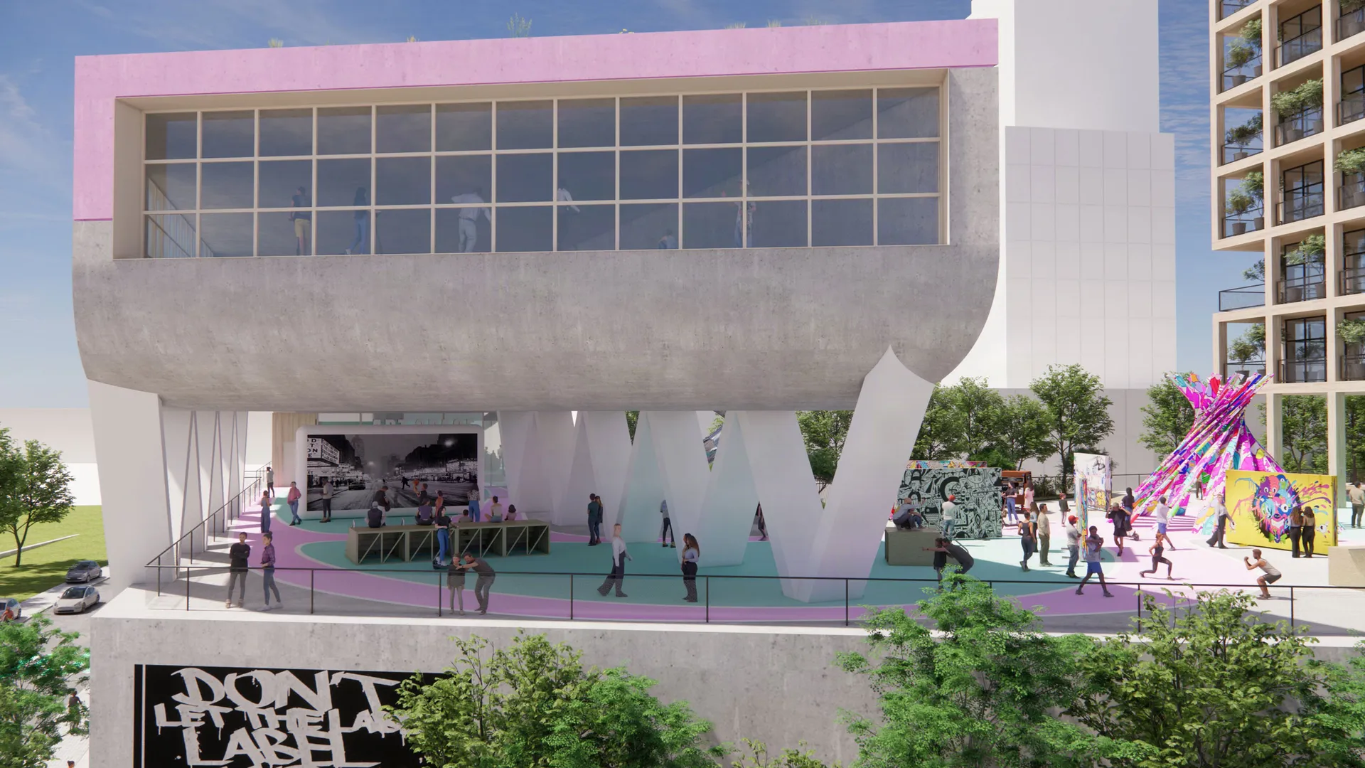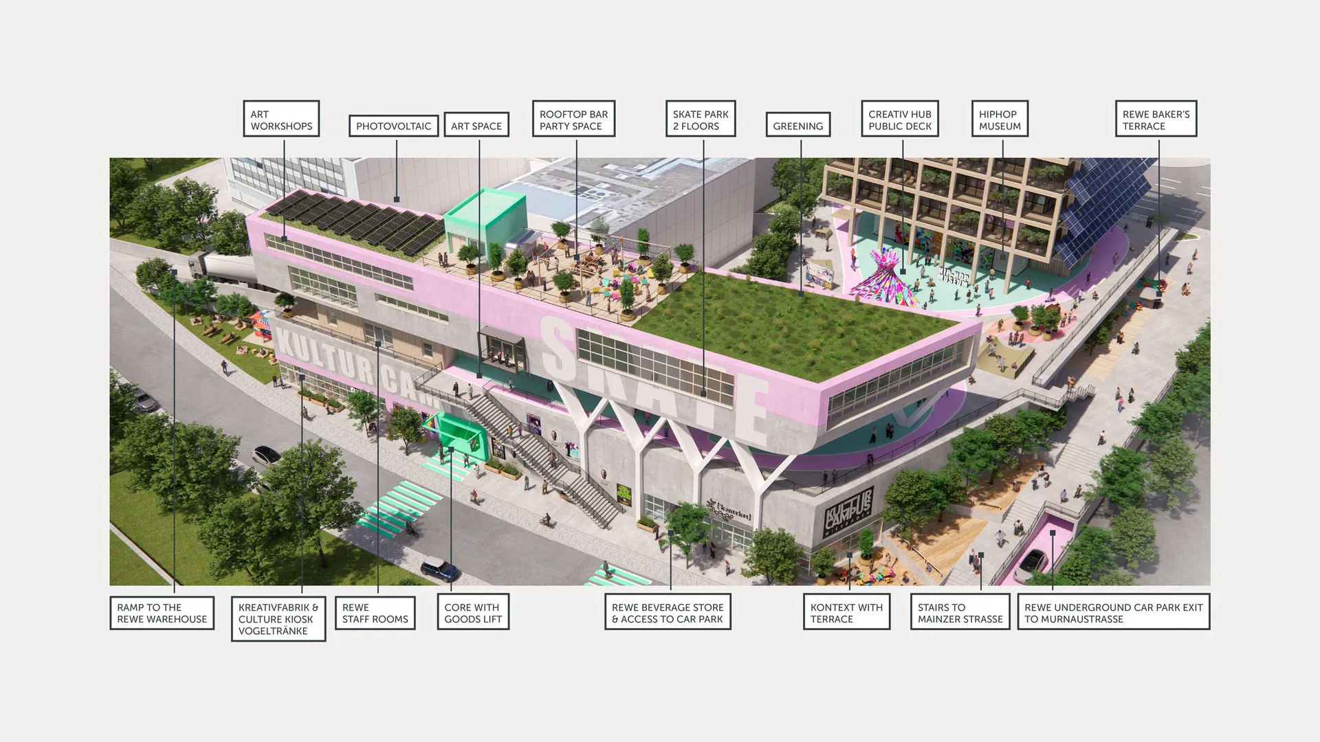 To the rear, the cultural buildings reinterpret the industrial character of the surrounding area. Their raw, flexible structures invite creative appropriation and evolution. Planned spaces include a Skate Hall, a multifunctional event venue for concerts, workshops, and club nights, as well as rehearsal rooms, artist studios, a rooftop bar, and an art gallery.