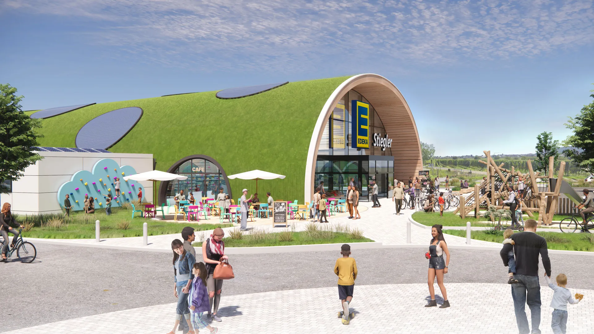 Der neue EDEKA Markt versteht sich nicht nur als Ort des Einkaufens, sondern als sozialer Treffpunkt für die Nachbarschaft. Ein Café mit Außenterrasse und ein begrünter Quartiersplatz laden zum Verweilen ein und fördern den Austausch im Viertel.