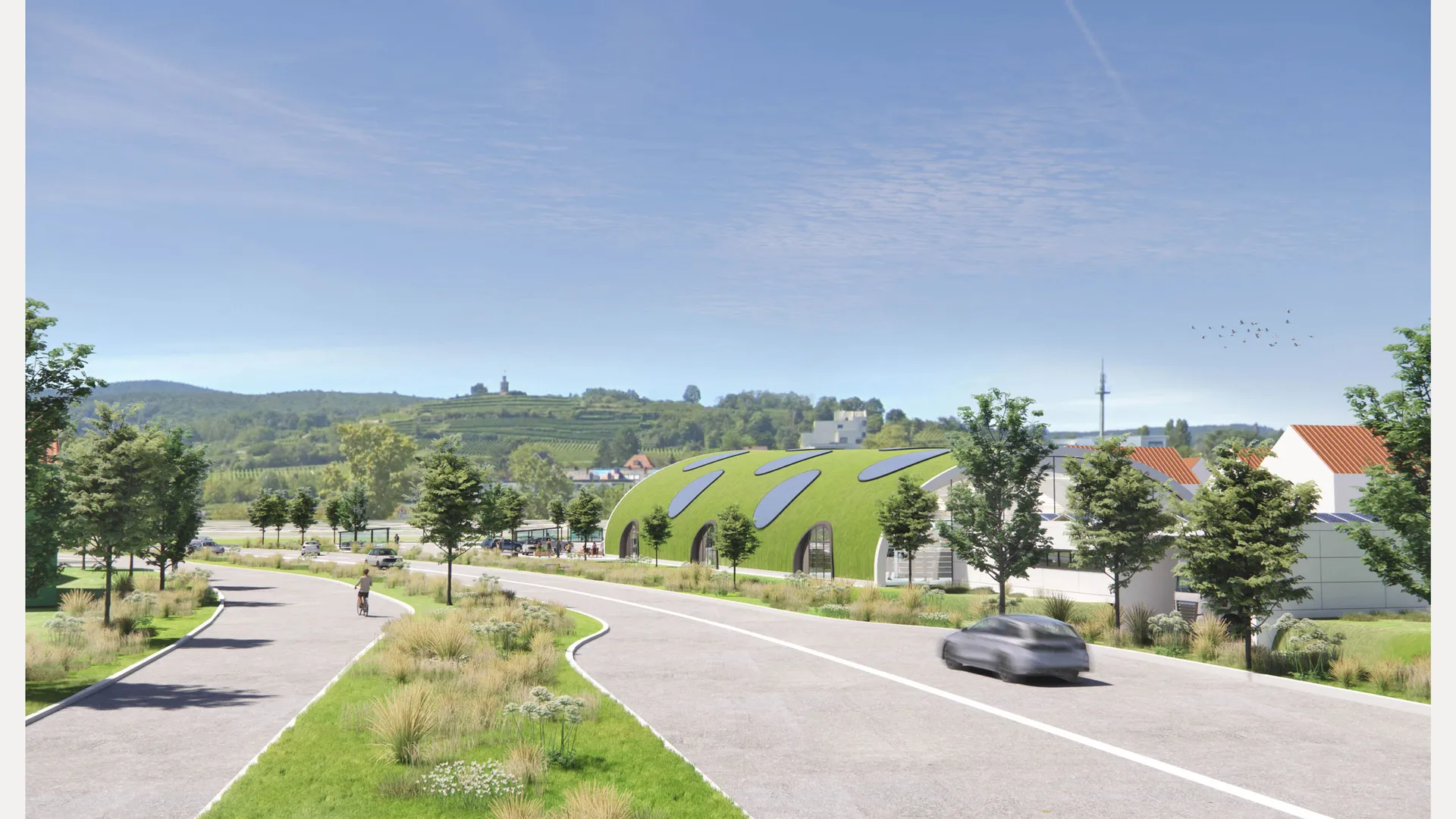 Ein begrüntes Dach und kreisförmig angeordnete Solarpanels greifen das Dubbeglas-Motiv auf und bilden zugleich das Herzstück des energetischen Konzepts. Die Photovoltaikanlage erzeugt sauberen Strom, während die Dachbegrünung das Mikroklima verbessert und zur Artenvielfalt beiträgt. Rund 50 neu gepflanzte Bäume und eine Insektenwiese stärken zusätzlich die ökologische Qualität des Standorts.